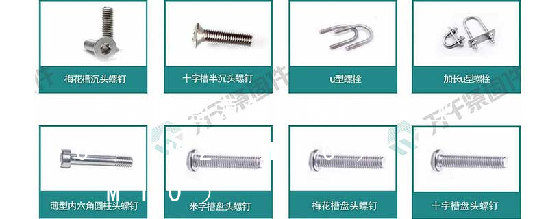 螺栓有:1、方頭螺栓,2、半圓頭方頸螺栓,3、十字槽盤頭螺釘,4、內六角沉頭螺釘,5、方螺母C級,6、蝶形螺母,7、六角頭螺栓,8、十字槽盤頭自攻螺釘。大小有M18、M6、M8、M16、M10、M12、M14、M20等型號。通常用